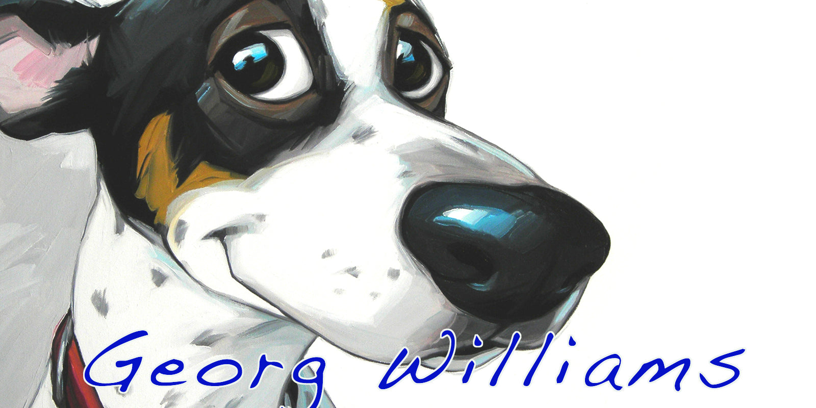 Georg shifted from photorealism back to the lighthearted, caricatured style of his youth, realizing that a laugh was a better compliment than polite praise. When a friend suggested he paint pet portraits, his head-and-shoulder style became so popular he left his day job to paint full time.